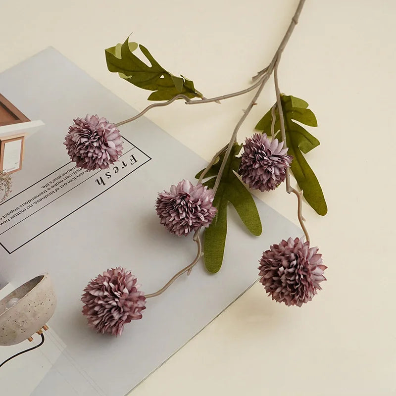 Textured pom blooms with a soft, autumn palette. This sculptural spray pairs ball shaped chrysanthemum heads with fresh green foliage for a refined, seasonal look. Each stem is lightly wired so you can fan and shape the branches for an airy arrangement with beautiful movement.